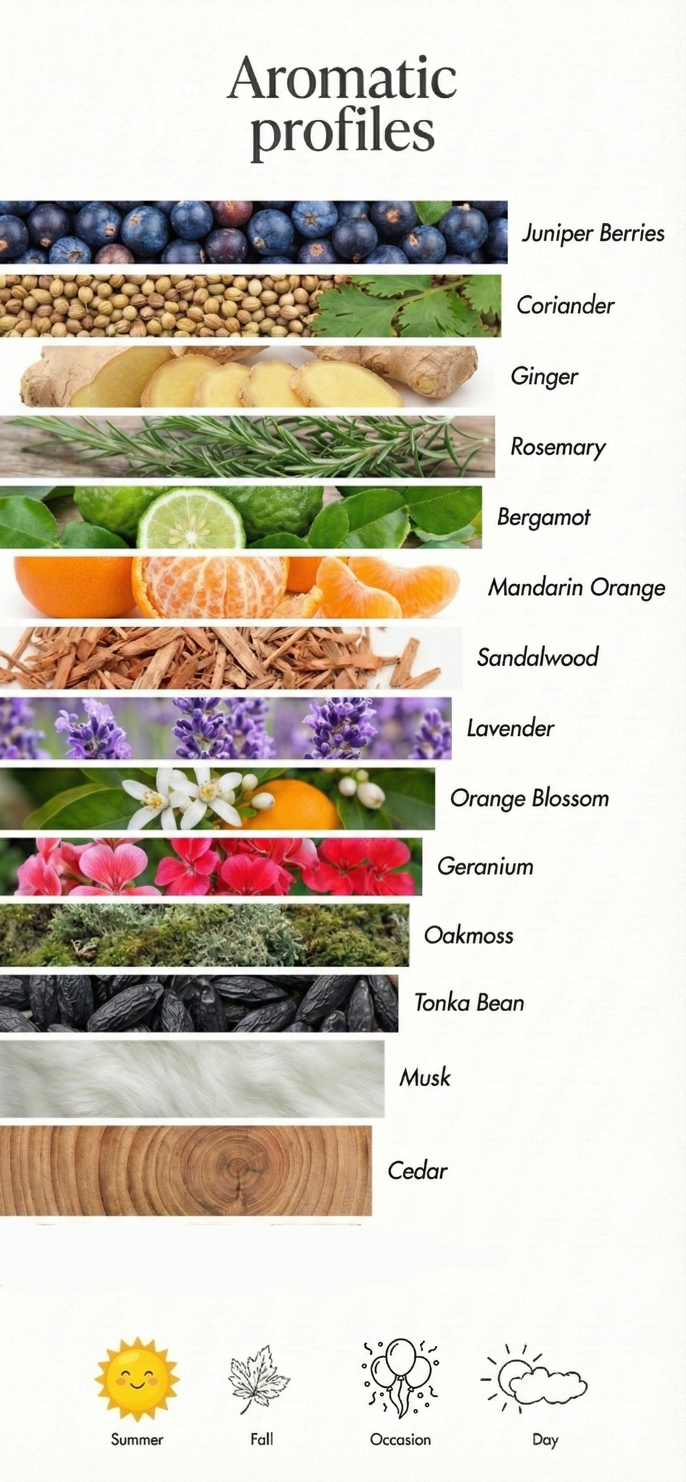 Top - Juniper Berries, Coriander, Ginger, Rosemary, Bergamot and Mandarin Orange